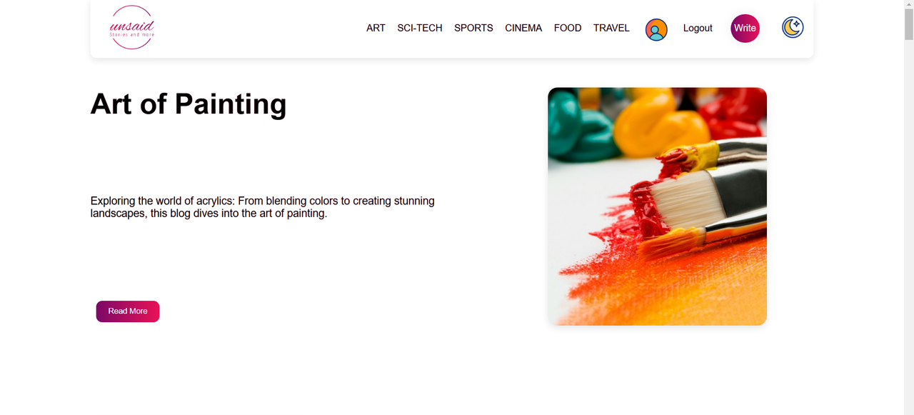 "Unsaid - Stories and More", a full-stack blog app - a React front end styled with Sass, a Node.js and Express backend for robust server operations, JWT authentication for security, and a MySQL database